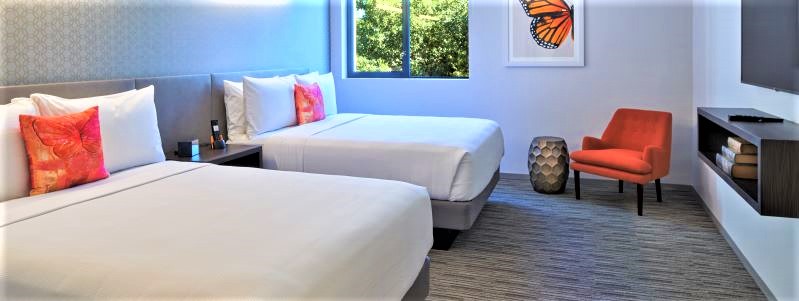 A spacious room with two queen beds, vibrant, contemporary décor, and upscale amenities